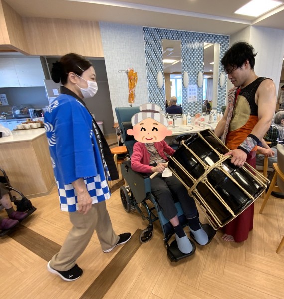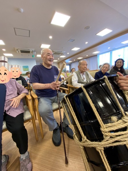 演奏の後は入居者様にも実際に太鼓を叩いていただきました。