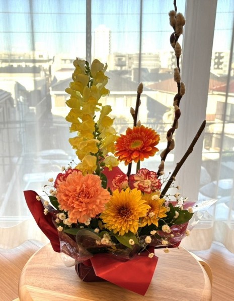黄色の金魚草と赤芽柳を使った、春の訪れを感じるアレンジメントに挑戦しました。