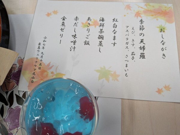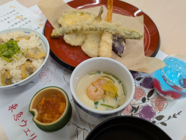 季節の天ぷらをメインに、お祝いにふさわしい紅白なます。