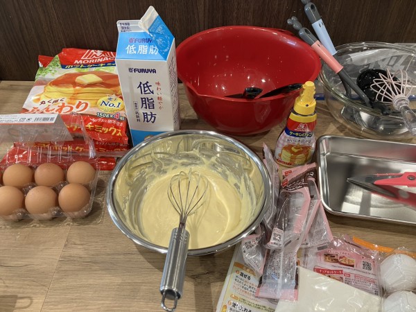 ボウルに卵、牛乳を入れホイッパーでよく混ぜ、