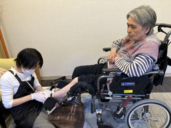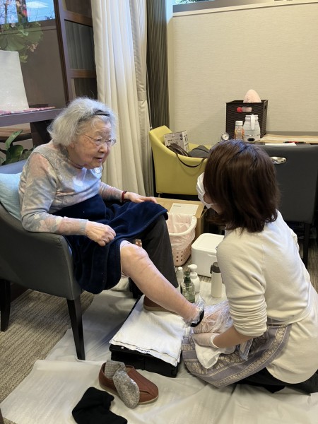 フットケアの最中は、セラピストが足の状態を丁寧に見ながら